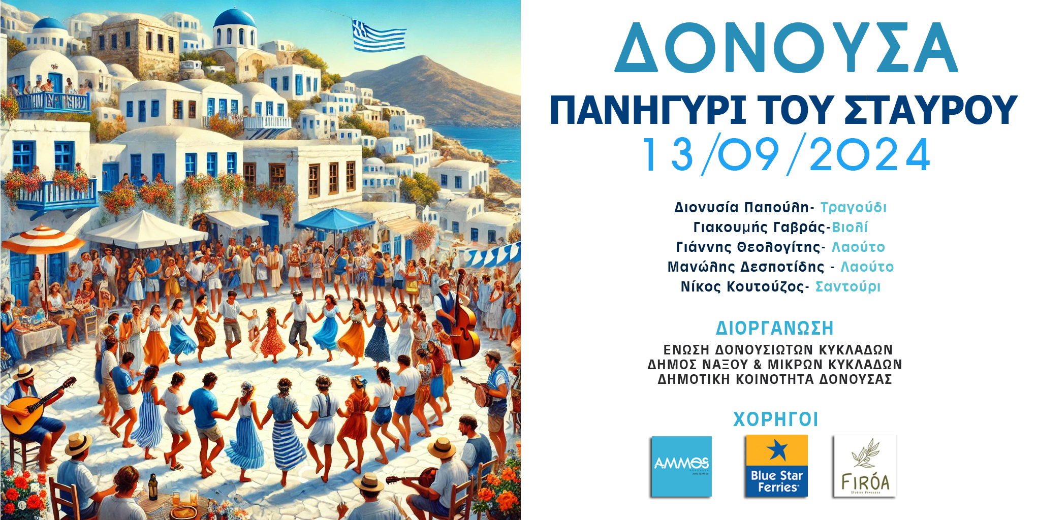 Η Ένωση Δονουσιωτών Κυκλάδων σε συνδιοργάνωση με τη Δημοτική Κοινότητα Δονούσας και το Δήμο Νάξου και Μικρών Κυκλάδων, σας προσκαλούν στο Πανηγύρι του Τιμίου Σταυρού στο λιμάνι της Δονούσας την Παρασκευή 13 Σεπτεμβρίου 2024.