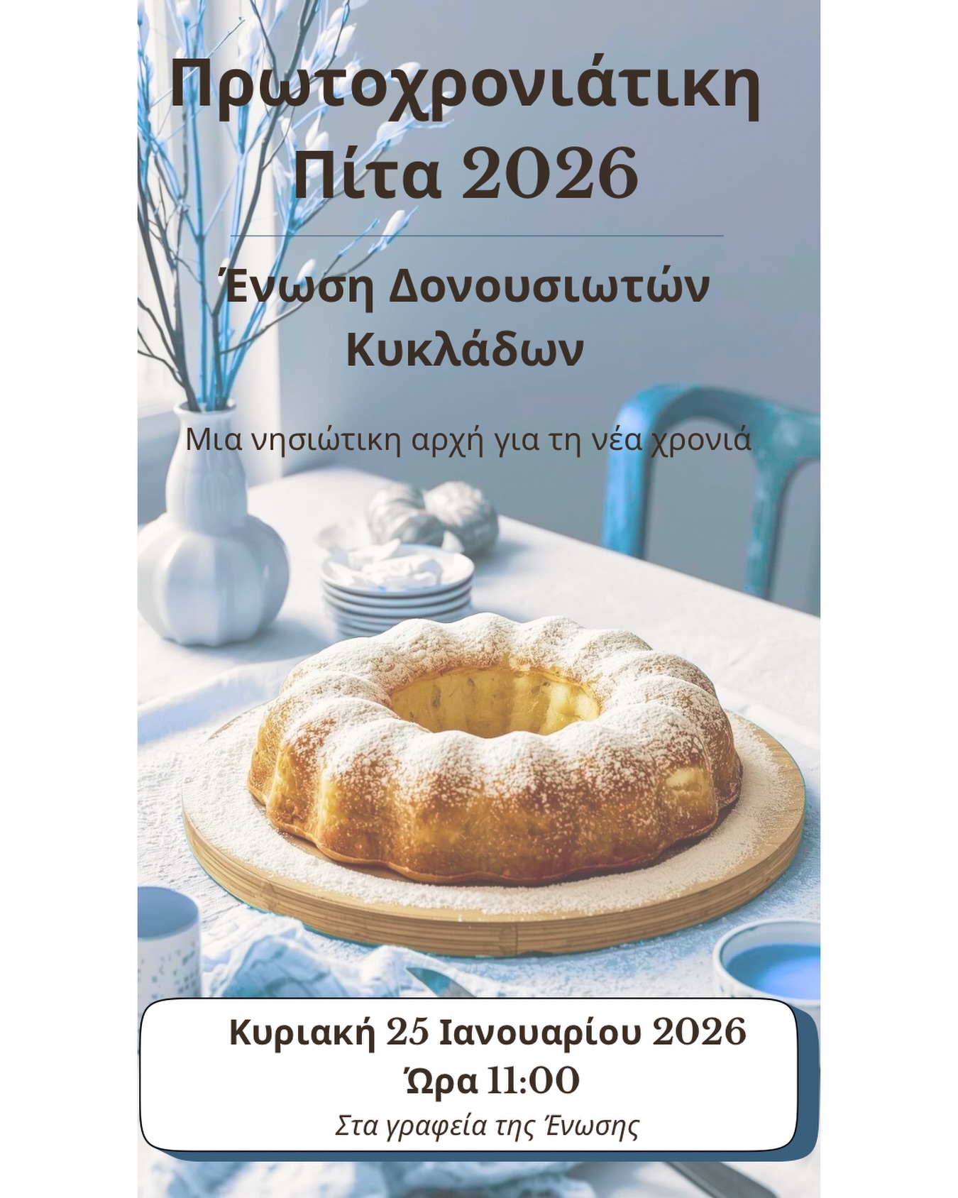 Ένωση Δονουσιωτών Κυκλάδων σας προσκαλεί στην κοπή της Πρωτοχρονιάτικης Πίτας.